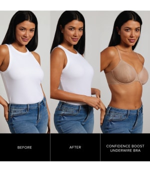 - Supportive bra lifts the bustline up to one inch for a confidence-inspiring look