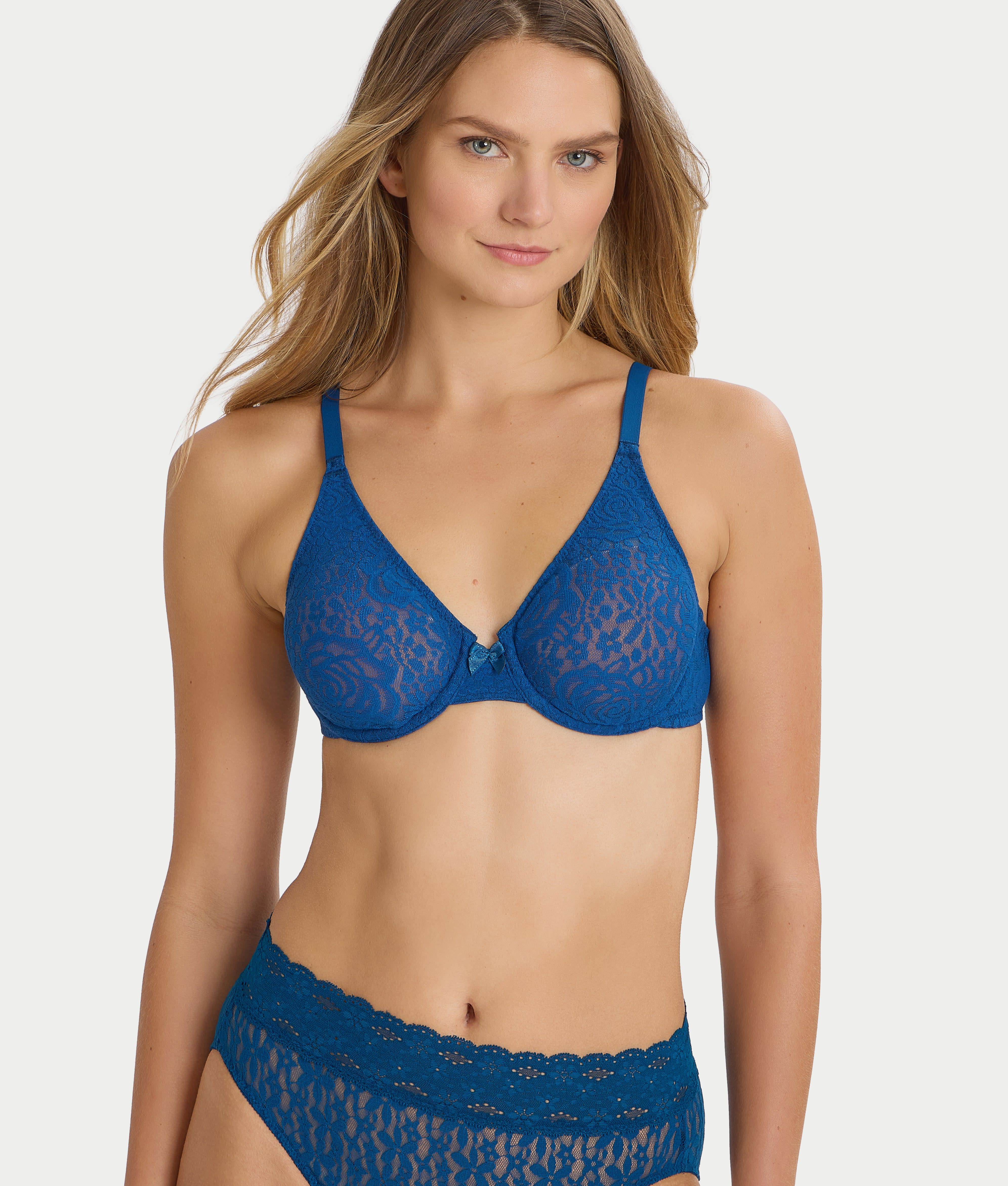 • Versatile, unlined underwire lace bra with J-hook