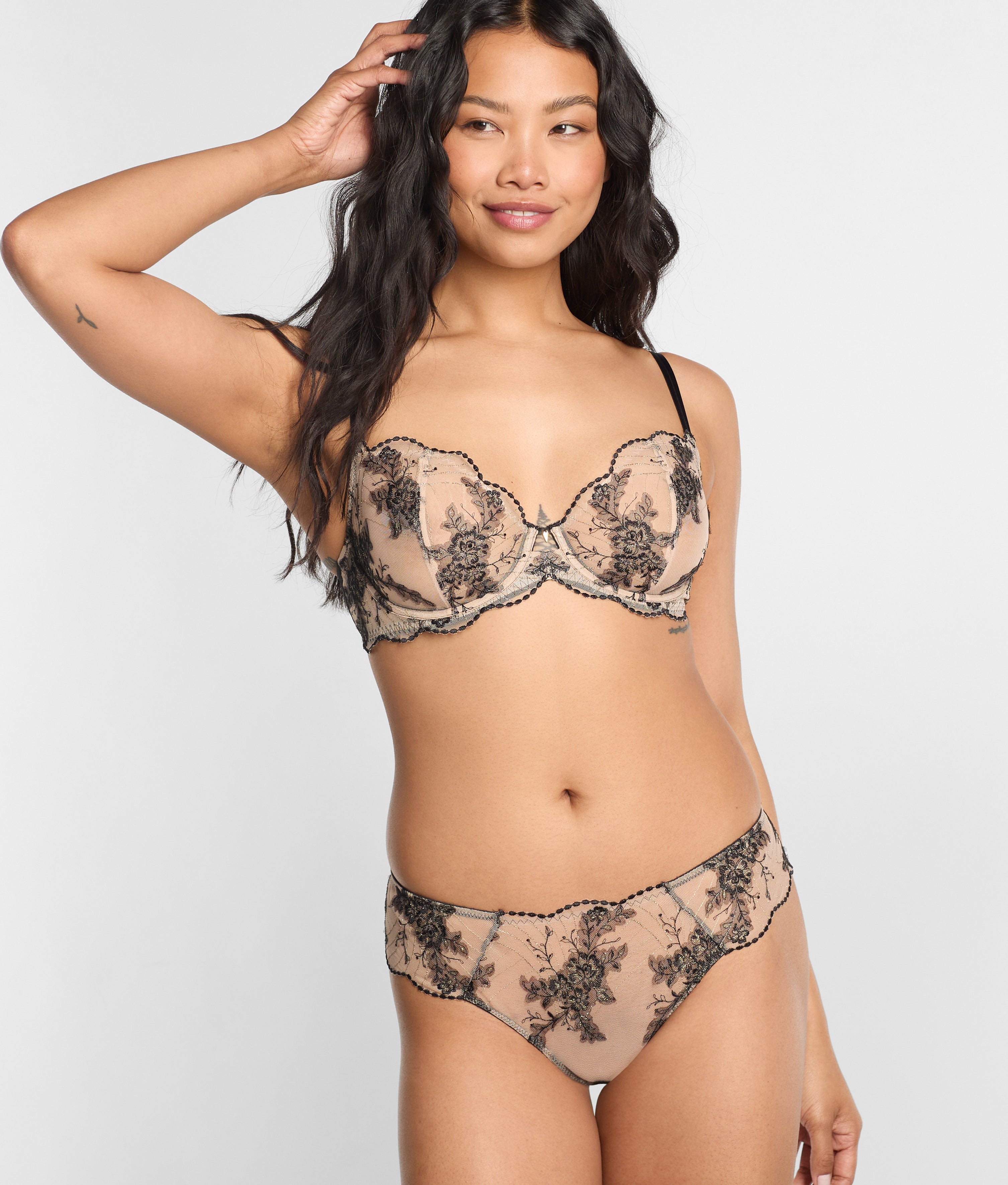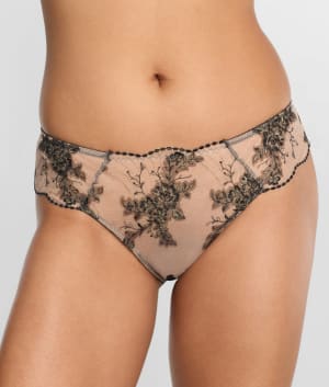 - Low rise with embroidered front and scalloped edges